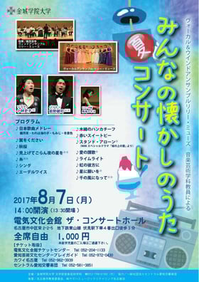 2017年8月7日〔月〕に開催される「みんなの懐かしのうた夏コンサート」(主催:金城学院大学文学部音楽芸術学科)に馬塲マサヨが伴奏者として出演致します。