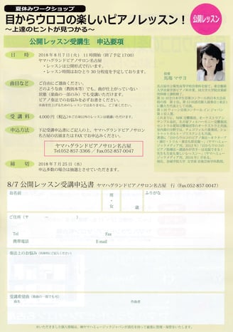 2018年7月から3回シリーズで「目からウロコの楽しいピアノレッスン!」講座がヤマハグランドピアノサロン名古屋で開催されます。その特別編”夏休みワークショップ”として8月7日に公開レッスンの開催が決定しました!つきましては公開レッスンの受講生を広く募集致します。