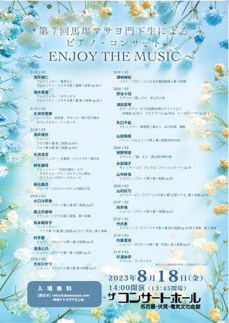 2023年8月18日 7回目となる馬塲マサヨ門下生によるピアノ・コンサートが開催されます。小学2年生から大学4年生まで総勢26名が日頃の練習の成果を披露いたします。