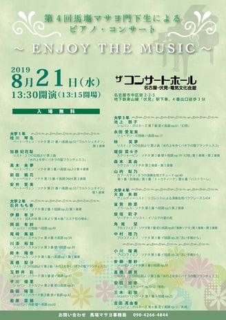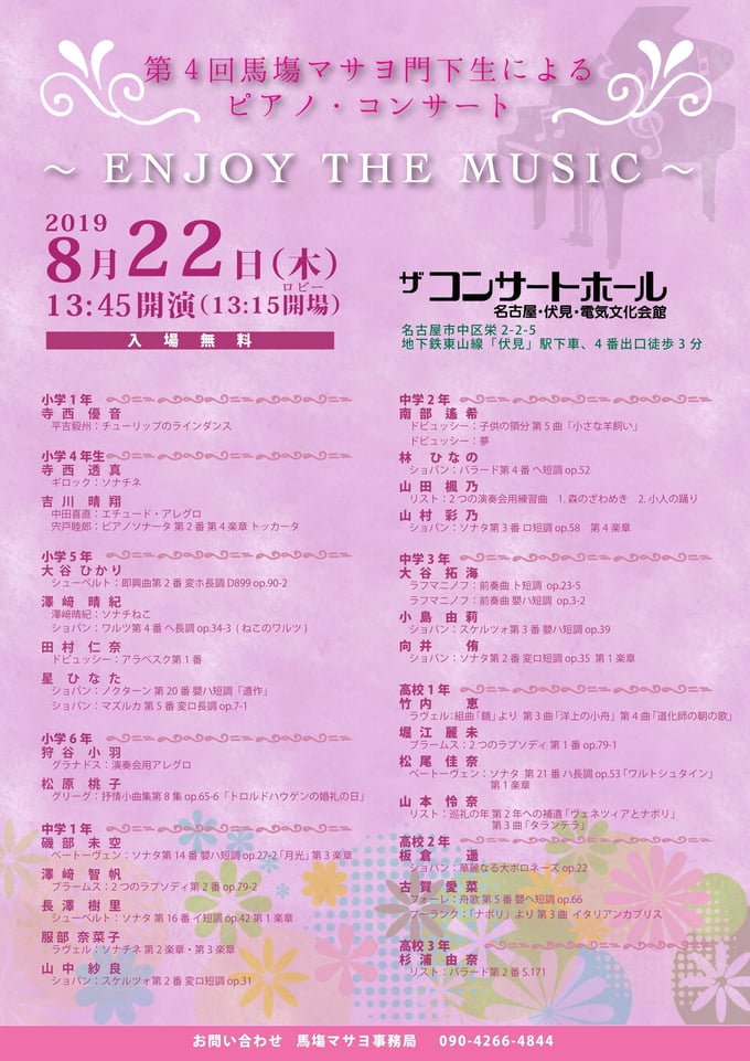 2019年8月21日・22日に電気文化会館で4回目となる馬塲マサヨ門下生によるピアノ・コンサートが開催されます。21日は大学生・社会人、22日は小学1年生から高校3年生までが、日頃の練習の成果を披露いたします。