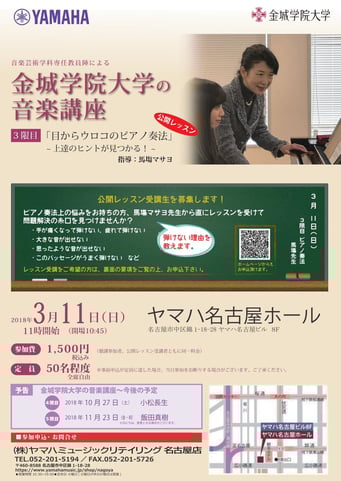 2018年3月11日〔日〕に開催される「金城学院大学の音楽講座3限目 目からウロコのピアノ奏法」(主催:金城学院大学文学部音楽芸術学科)に馬塲マサヨが講座指導者として登場致します。