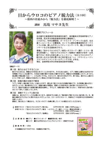 「目からウロコのピアノ奏法」ではレッスン受講生(公開レッスン形式)を募集しております。ピアノ奏法上のお悩みをお持ちの方、この機会に馬塲マサヨから直接レッスンを受けて問題解決の糸口を見つけませんか?ご応募お待ちしております。