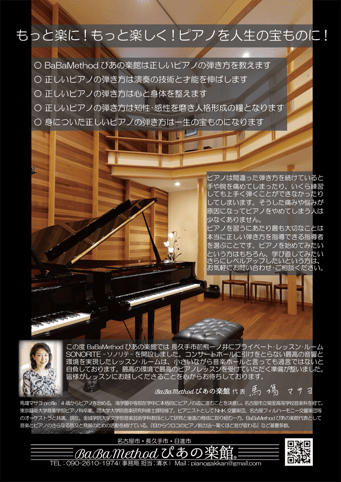 この度 BaBaMethodぴあの楽館では 長久手市前熊一ノ井にプライベート・レッスン・ルーム「SONORITE -ソノリテ-」を開設しました。コンサートホールに引けをとらない最高の音響と環境を実現したレッスン・ルームは、小さいながら音楽ホールと言っても過言ではないと自負しております。最高の環境で最高のピアノレッスンを受けていただく準備が整いました。皆様がレッスンにお越しくださることを心からお待ちしております。