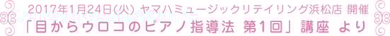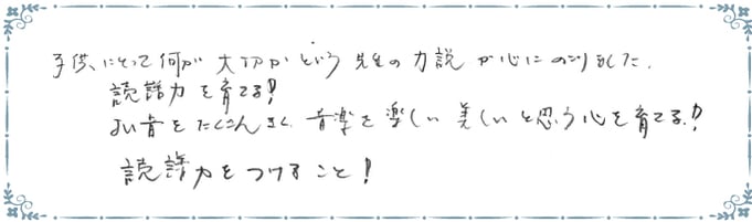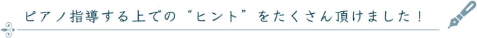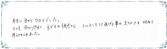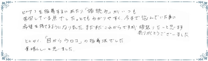 ピアノを指導するにあたり、「譜読み」がいつも苦労している点でした。とてもわかりやすく、今まで悩んでいた事に、希望を持てるようになりました。まだまだこれからですが、頑張りたいと思います。ありがとうございました。とにかく「目からウロコ」の指導法でした。素晴らしいと思いました。