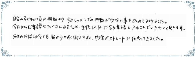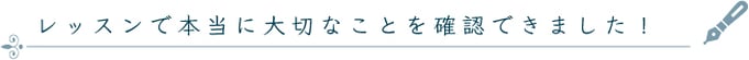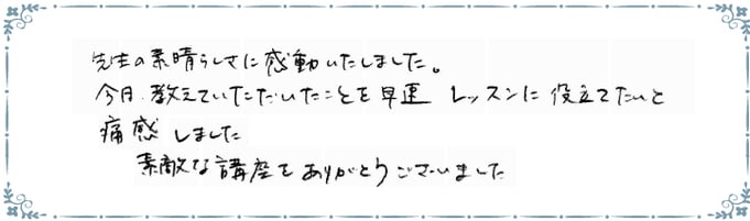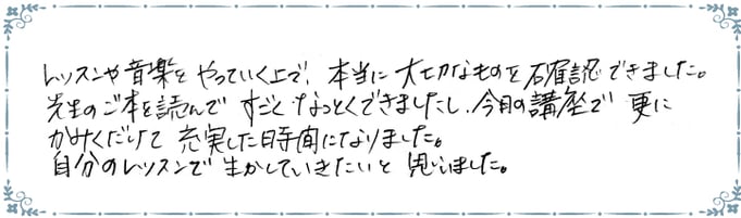 先生のご本を読んで、すごく納得で出来ましたし、今日の講座で、更にかみくだけて充実した時間になりました。自分のレッスンで生かして行きたいと思いました。