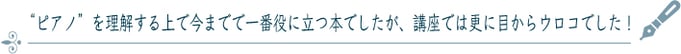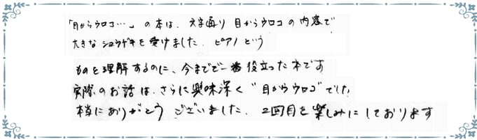 「目からウロコ・・・」の本は、文字通り目からウロコの内容で大きな衝撃を受けました。ピアノと言うものを理解するのに、今までで一番役立った本です。実際のお話は、更に興味深く“目からウロコ”でした。本当にありがとうございました。二回目を楽しみにしております。
