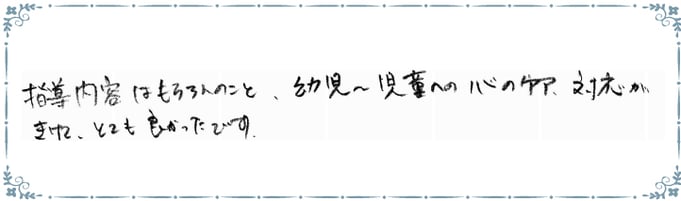 指導内容はもちろんの事、幼児~児童への心のケア・対応が聞けて、とても良かったです。