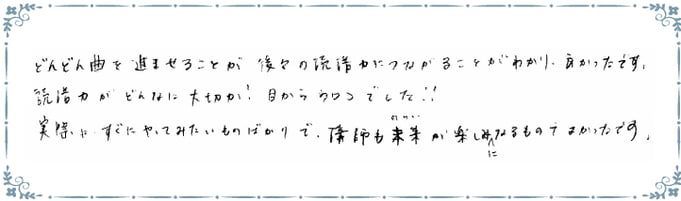 どんどん曲を進ませることが、後々の読譜力に繋がることが分かり良かったです。
