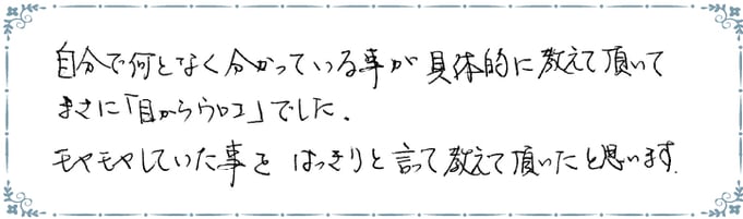 自分で何となく分かっている事を、具体的に教えて頂いて、まさに「目からウロコ」でした。モヤモヤしていた事を、はっきり教えて頂けたと思います。