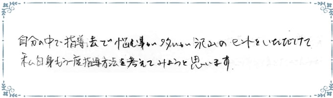 自分の中で指導法を悩む事が多いが、沢山のヒントを頂けて、私自身もう一度指導方法を考えてみようと思います。