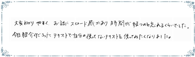 大変わかりやすく、お話にスピード感があり、時間が経つのを忘れるくらいでした。今日紹介下さったテキストで、自分の使っていないテキストを使ってみたくなりました。